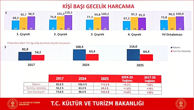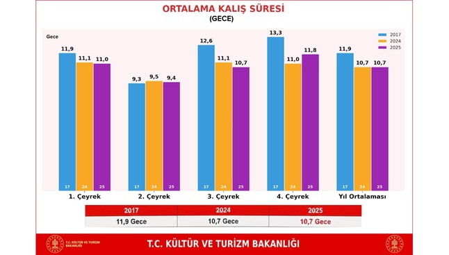 Buna karşın, ortalama kalış süresi 2017’de 11,9 gece iken, 2024 ve 2025’te 10,7 geceye düştü.