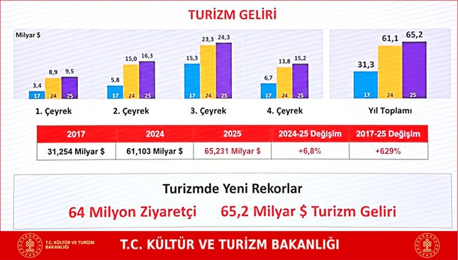 MURAT TÜZEL TÜİK’E GÖRE HEPİMİZ ÇOK ZENGİNİZ AMA FARKINDA DEĞİLİZ 2025 yılı Turizm Değerlendirme Toplantısı İstanbul’da gerçekleşti. TÜİK’in verilerinin ele alındığı toplantıda Türk turizminin küresel ölçekte ulaştığı güce dikkat çekildi. TÜİK’in verilerine göre Türk turizmi 2025 yılında rekor kırdı ve Cumhuriyet tarihinde ilk kez 65 milyon ziyaretçi ve 65,2 Milyar dolar turizm geliriyle tüm zamanların en yüksek seviyesini gördü. Bu durum biz turizmcilerin görüş alanına henüz girmese de bir yerlerde rekorlar kırıldığına eminiz. Paylaşılan verilere göre, turizm gelirleri 2017 yılına kıyasla yüzde 109 artış gösterdi. 2017 yılında 31,254 milyar dolar ve 2024 yılında 61,103 milyar dolar olan turizm geliri 2025 yılında 65, 231 milyar dolara ulaştı. 2025 yılında ziyaretçi sayısı yüzde 68 artış gösterdi. 2017 yılında 37 milyon 970 bin, 2024 yılında ise 62 milyon 270 bin olan ziyaretçi sayısı 2025’de 63 milyon 941 bine yükseldi.